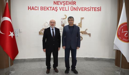 Kayseri Üniversitesi Rektörü Prof. Dr. Kurtuluş Karamustafa, Nevşehir Hacı Bektaş Veli Üniversitesi (NEVÜ) Rektörü Prof. Dr. Semih Aktekin’i makamında ziyaret etti.