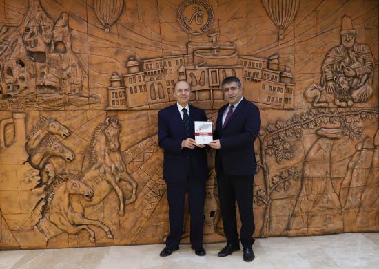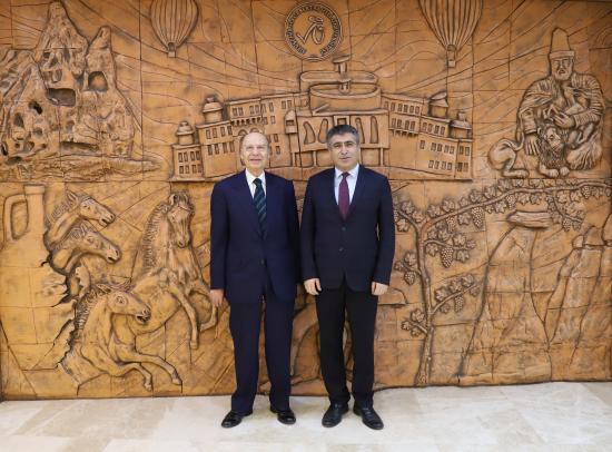 Nevşehir Hacı Bektaş Veli Üniversitesi (NEVÜ)’de düzenlenen “Diplomasi Okumaları III” etkinliğine katılmak üzere NEVÜ’de bulunan Emekli Büyükelçi Numan Hazar Rektör Prof. Dr. Semih Aktekin’i ziyaret etti.