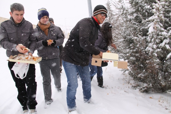 Kar yağışına bağlı olarak, özellikle kuşların kapanan zeminlerde yiyecek bulmakta zorlanmaları nedeniyle böyle bir girişimde bulunduklarını belirten Üniversitemiz Öğrenci Konseyi Başkan Yardımcısı Mustafa Özsoy, “Yoğun kar yağışı ve aşırı soğuklardan biz insanlar kadar yabani hayvanlar da olumsuz etkileniyor. Çünkü karla kaplı zeminlerde yiyecek ve su bulamayan yaban hayvanları ve özellikle kuşlar, açlık ve soğuktan donarak ölüyorlar. Biz de Nevşehir Üniversitesi Öğrenci Konseyi üyeleri olarak yabani hayvanların ve kuşların aç kalarak donmamaları için üniversitemiz yerleşkesi içerisinde yer alan belli noktalara ve ağaç atlarına karton kutular içerisinde ekmek bıraktık.