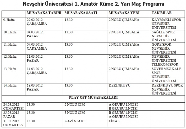Nevşehir Üniversitesi 1. Amatör Küme 2. Yarı Maç Programı