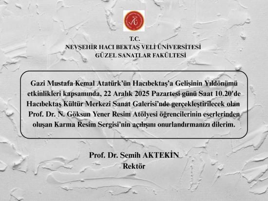 Karma Resim Sergisi, Gazi Mustafa Kemal Atatürk’ün Hacıbektaş’a gelişinin yıldönümünü temsilen, 22 Aralık 2025 tarihinde saat 10:20’de Hacıbektaş Kültür Merkezi Sanat Galerisi’nde gerçekleştirilecek.