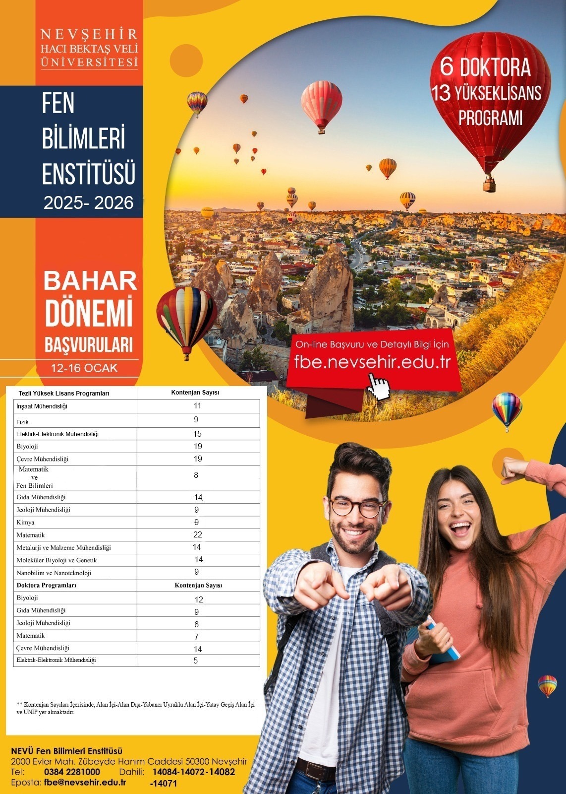 NEVÜ-Fen Bilimleri Enstitüsü tarafından lisansüstü programlara öğrenci kabul edilecektir. Adaylar başvurularını 12-16 Ocak 2026 tarihleri arasında çevrimiçi olarak yapacaklardır.