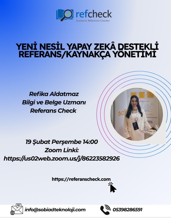 Araştırmacıların, Referans Check (https://referanscheck.com) hakkında merak ettiği tüm içerik bilgileri bu eğitimde sunulacaktır. Eğitim kapsamında, kaynakça ve atıf kontrollerinin yapay zekâ destekli olarak nasıl gerçekleştirildiği, sistemin sunduğu otomatik analiz araçları ve kullanıcıların kaynakça düzenleme süreçlerinde nasıl zaman kazanabileceği gibi konular ele alınacaktır.