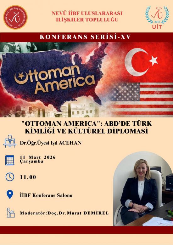 NEVÜ İİBF Uluslararası İlişkiler Topluluğu tarafından 11 Mart 2026 Çarşamba günü saat 11.00'de İİBF Konferans Salonu'nda Dr. Öğr. Üyesi Işıl ACEHAN'ın konuk konuşmacı olacağı "'Ottoman America': ABD'de Türk Kimliği ve Kültürel Diplomasi" temalı konferans düzenlenecektir. Türk kimliğinin Amerika'daki tarihsel sürecinin ele alınacağı etkinliğe tüm öğrencilerimiz ve akademik personelimiz davetlidir.