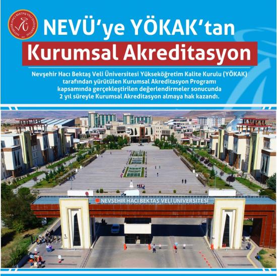 Nevşehir Hacı Bektaş Veli Üniversitesi (NEVÜ), Yükseköğretim Kalite Kurulu (YÖKAK) tarafından yürütülen Kurumsal Akreditasyon Programı kapsamında gerçekleştirilen değerlendirmeler sonucunda 2 yıl süreyle Kurumsal Akreditasyon almaya hak kazandı.