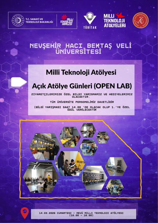 Nevşehir Hacı Bektaş Veli Üniversitesi bünyesinde faaliyet gösteren Milli Teknoloji Atölyesi tarafından “Açık Atölye Günleri (Open Lab)” etkinliği düzenlenecek. Teknolojiye ilgi duyan üniversite personeli ve öğrencilerin davetli olduğu etkinlikte, katılımcılar atölyede yürütülen çalışmalar hakkında yakından bilgi alma fırsatı bulacak.