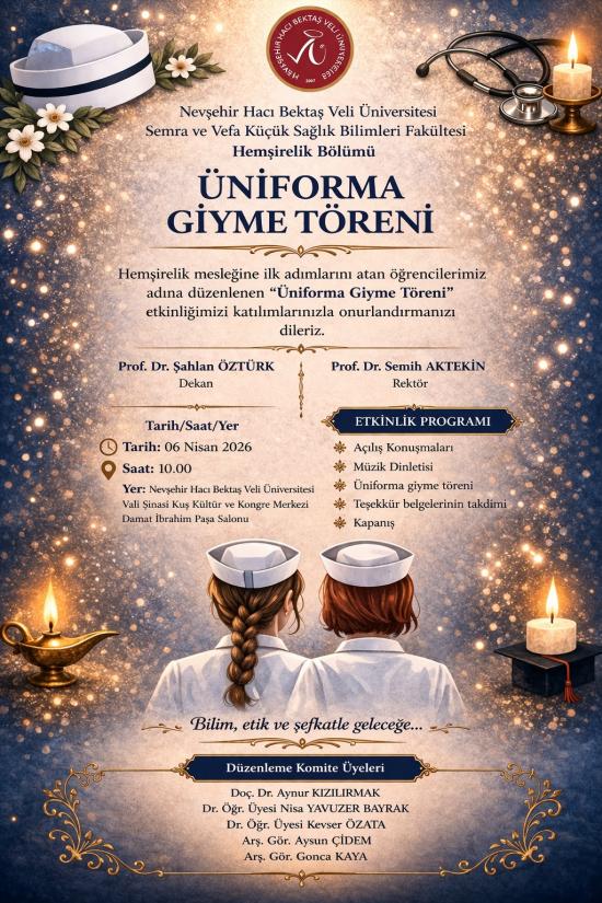 Üniversitemiz Semra ve Vefa Küçük Sağlık Bilimleri Fakültesi, Hemşirelik Bölümü tarafından 06 Nisan 2026 Pazartesi günü saat 10.00’da NEVÜ Vali Şinasi Kuş Kültür ve Kongre Merkezi Damat İbrahim Paşa Salonu'nda “Üniforma Giyme Töreni” etkinliği gerçekleştirilecektir.