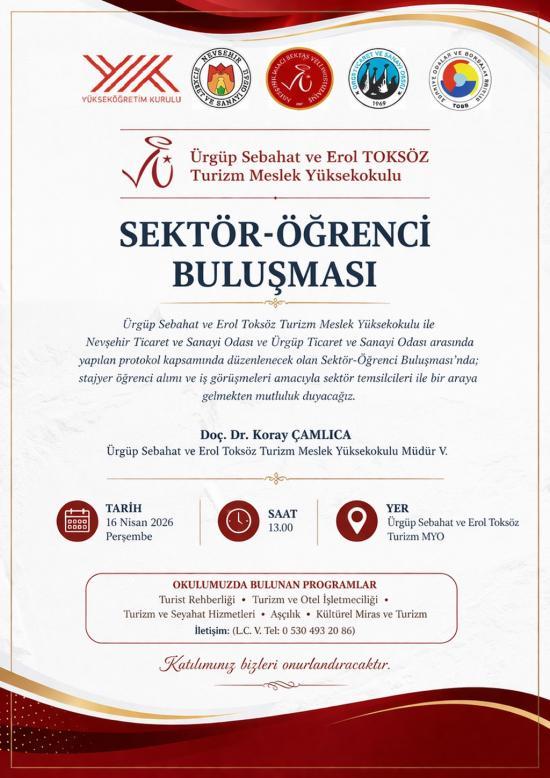Nevşehir Ticaret ve Sanayi Odası ile Ürgüp Ticaret ve Sanayi Odası arasında imzalanan protokol kapsamında düzenleyeceğimiz "Sektör-Öğrenci Buluşması" etkinliğimizde; stajyer öğrenci alımı ve iş görüşmeleri gerçekleştirilecektir. Sektör temsilcileri ile öğrencilerimiz arasındaki bağı güçlendirmeyi hedeflediğimiz bu anlamlı günde sizleri de aramızda görmekten mutluluk duyarız.