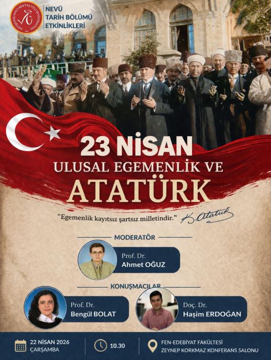 23 Nisan Ulusal Egemenlik ve Çocuk Bayramı kutlamaları kapsamında NEVÜ Tarih bölümü tarafından “23 Nisan Ulusal Egemenlik ve Atatürk” adlı etkinlik gerçekleştirilecektir.