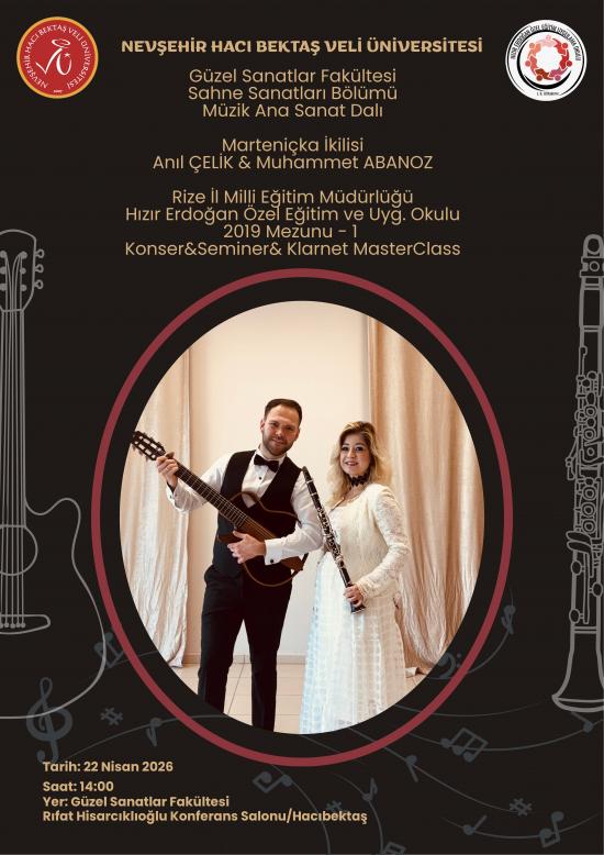 Nevşehir Hacı Bektaş Veli Üniversitesi Güzel Sanatlar Fakültesi Sahne Sanatları Bölümü Müzik Ana Sanat Dalı Klarnet Sanatçısı Doç. Anıl ÇELİK ve Güzel Sanatlar Fakültesi Sahne Sanatları Bölümü Müzik Ana Sanat Dalı 2019 Mezunu Sayın Muhammet ABANOZ Rize İl Milli Eğitim Müdürlüğü Hızır Erdoğan Özel Eğitim ve Uygulama Okulu ve Güzel Sanatlar Fakültesi Sahne Sanatları Bölümü Müzik Ana Sanat Dalı işbirliği ile gerçekleştirilecek olan “Konser & Seminer ve Clarinet Masterclass” etkinlikleri düzenlenecektir.
