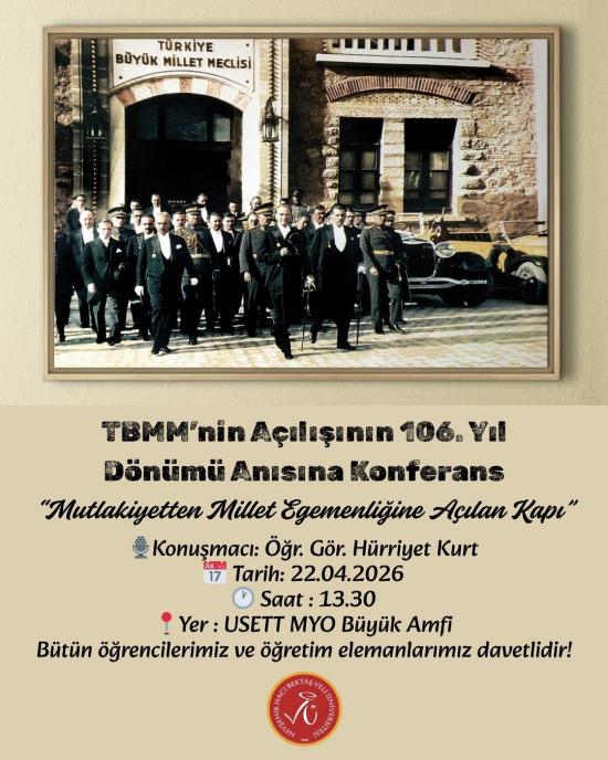 Nevşehir Hacı Bektaş Veli Üniversitesi Ürgüp Sebahat ve Erol Toksöz Turizm Meslek Yüksekokulu tarafından, Türkiye Büyük Millet Meclisi’nin açılışının 106. yıl dönümü kapsamında bir anma konferansı düzenlenecektir. Millî egemenlik düşüncesinin tarihsel gelişimini ve Osmanlı’daki mutlakiyet anlayışından halk egemenliğine geçiş sürecini ele almak amacıyla planlanan etkinlikte, “Mutlakiyetten Millet Egemenliğine Açılan Kapı” başlıklı bir sunum gerçekleştirilecektir.
