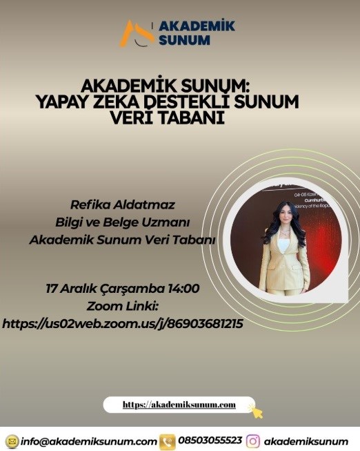 Akademik Sunum Veri Tabanı tarafından, "Akademik Sunum: Yapay Zeka Destekli Sunum Veri Tabanı" eğitimi gerçekleştirilecektir.