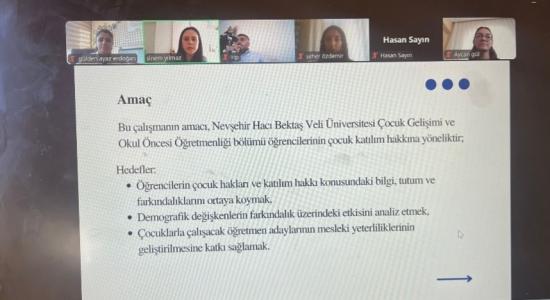 Fatma Sinem Yılmaz ve Aycan Gül tarafından, öğretim üyesi Dr. Gülden Erdoğan danışmanlığında yürütülen “Çocuk Katılım Hakkı” konulu proje ise 2-3 Ekim 2025 tarihlerinde Van Yüzüncü Yıl Üniversitesi Sosyal Bilimler Enstitüsü’nde sunuldu. Proje, NEVÜ öğrencilerinin çocuk katılım hakkına yönelik farkındalık düzeylerini belirlemeyi amaçladı. Çalışma kapsamında öğrencilere anket uygulanarak görüşleri değerlendirildi ve farkındalık artırıcı broşürler hazırlandı. Proje, çocukların karar süreçlerine katılımının önemine dikkat çekti.