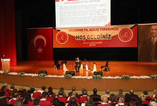 Açılışta konuşmasına yeni akademik yılın tüm öğrencilere, ailelerine, akademik ve idari personele hayırlı olmasını dileyerek başlayan Rektör Prof. Dr. Semih Aktekin, eğitimin toplumların gelişiminde belirleyici bir unsur olduğunu vurgulayarak, üniversitelerin bilimin, kültürün ve sanatın üretildiği en önemli kurumlar olduğunu söyledi.