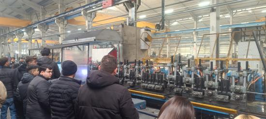 Teknik gezinin ilk durağı olan NEVSAC Boru firmasında, öğrenciler çelik sacların hammadde olarak girişinden sevkiyata hazır boru ve profil hâline gelmesine kadar tüm üretim sürecini yerinde gözlemledi. Üretim aşamaları; kesim, haddeleme, şekillendirme, yüksek frekans indüksiyon kaynağı ile birleştirme, ölçülendirme ve kalite kontrolleri gibi birçok ileri üretim tekniğini içermekte olup, öğrencilere sektörel uygulamalar hakkında önemli kazanımlar sundu.