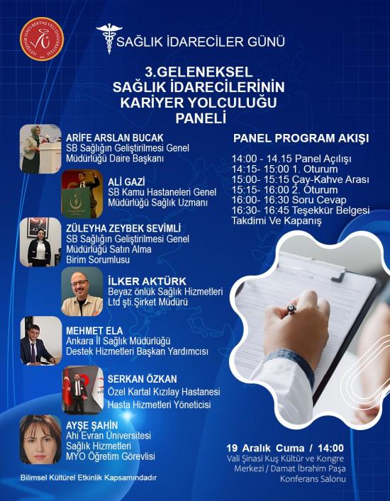 Sağlık İdarecileri Günü kapsamında, SHMYO Yönetim ve Organizasyon Bölümü tarafından organize edilen "3. Geleneksel Sağlık İdarecilerinin Kariyer Yolculuğu Paneli", sağlık sektöründe kariyer planlayan öğrenciler ile kamu, özel sektör ve akademiden deneyimli sağlık idarecilerini bir araya getirecektir.