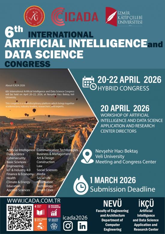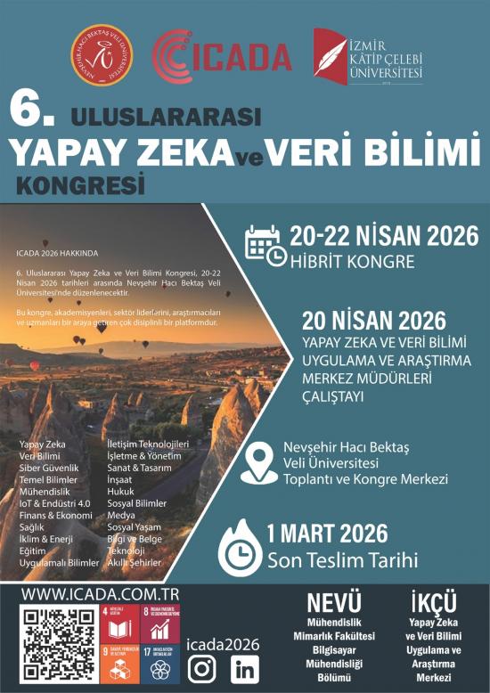 İzmir Kâtip Çelebi Üniversitesi Yapay Zekâ ve Veri Bilimi Uygulama ve Araştırma Merkezi tarafından her yıl düzenlenen Uluslararası Yapay Zekâ ve Veri Bilimi Kongresi (ICADA 2026)’nin 6. (Altıncısı) 20–22 Nisan 2026 tarihleri arasında Nevşehir Hacı Bektaş Veli Üniversitesi ev sahipliğinde gerçekleştirilecektir.