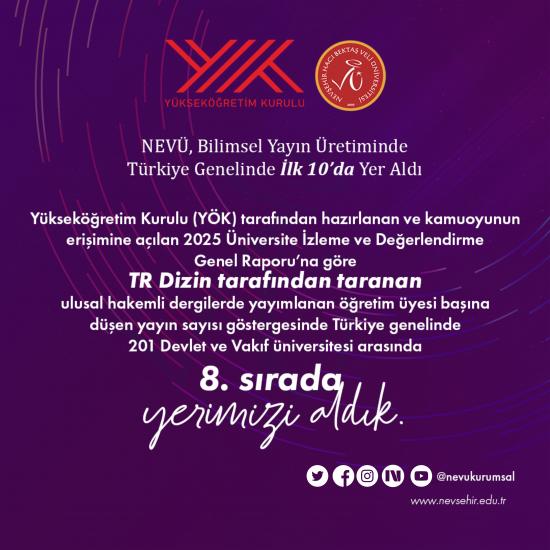 Kalite odaklı yönetim anlayışı doğrultusunda hareket eden NEVÜ’nün, eğitim-öğretim, araştırma-geliştirme ve toplumsal katkı alanlarında sürdürülebilir gelişimi hedeflediği vurgulanırken, elde edilen bu sonucun üniversitenin ulusal ölçekte bilimsel görünürlüğünü güçlendirdiği ve akademik yayın performansındaki istikrarlı yükselişi teyit ettiği değerlendirildi.