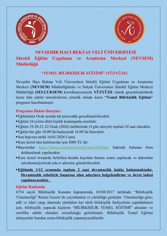 Nevşehir Hacı Bektaş Veli Üniversitesi Sürekli Eğitim Uygulama ve Araştırma Merkezi (NEVSEM) Müdürlüğümüz ve Selçuk Üniversitesi Sürekli Eğitim Merkezi Müdürlüğü (SELÇUKSEM) koordinasyonuyla YÜZYÜZE olarak gerçekleştirilmek üzere tüm sektör temsilcilerine yönelik olmak üzere “Temel Bilirkişilik Eğitimi” programı hazırlanmıştır.