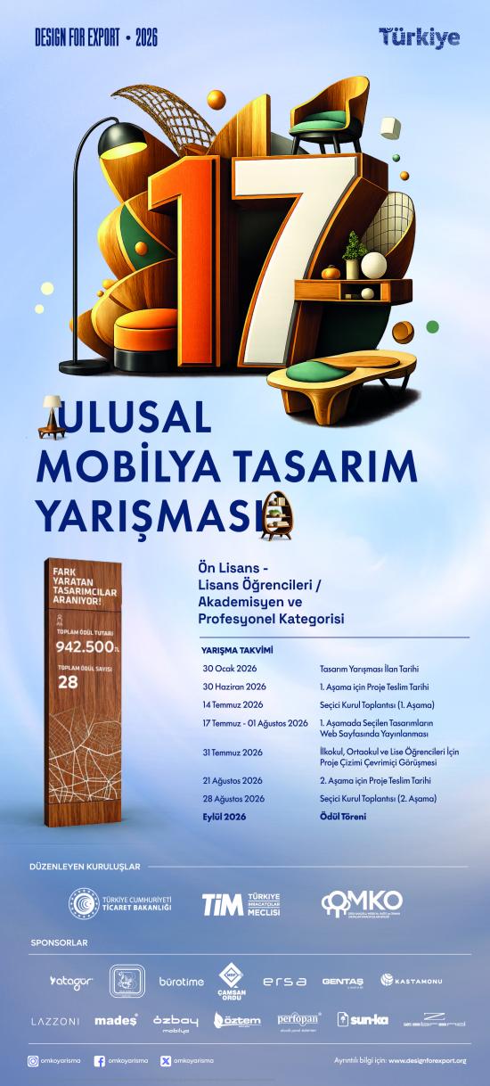 Ticaret Bakanlığı koordinasyonunda, Türkiye İhracatçılar Meclisi (TİM) iş birliğiyle, Orta Anadolu Mobilya, Kağıt ve Orman Ürünleri İhracatçıları Birliği tarafından düzenlenen “İhracatçı Birlikleri - 17. Ulusal Mobilya Tasarım Yarışması” ödül töreninin Eylül 2026'da yapılması planlanmaktadır. Yarışma, mobilya sektörünün gelişimine katkıda bulunmayı ve tasarımın endüstri için önemini vurgulamayı amaçlamaktadır.