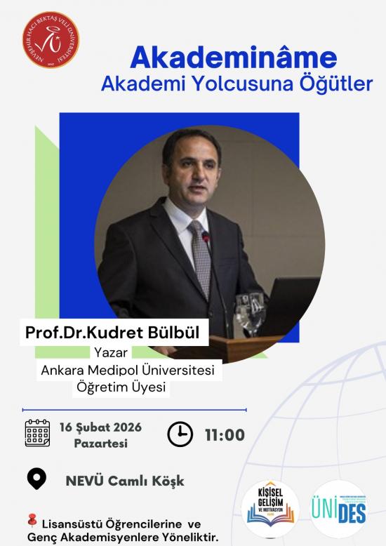 Prof. Dr. Kudret Bülbül’ün katılımıyla 16 Şubat 2026 Pazartesi günü saat 11.00’de NEVÜ Camlı Köşk’te lisansüstü öğrenciler ve genç akademisyenlere yönelik ''Akademinâme: Akademi Yolcusuna Öğütler'' temalı konferansımız düzenlenecektir.