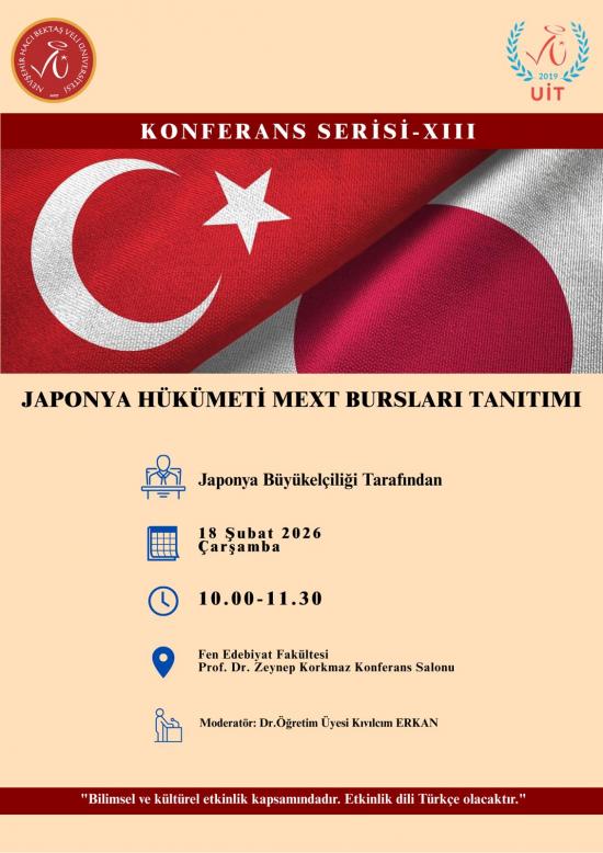 NEVÜ Uluslararası İlişkiler Topluluğu tarafından organize edilen ve Dr. Öğretim Üyesi Kıvılcım ERKAN moderatörlüğünde "Japonya Hükümeti MEXT Bursları Tanıtımı" başlıklı etkinlik 18 Şubat 2026 Çarşamba günü saat 10.00'da Üniversitemiz Fen Edebiyat Fakültesi Prof. Dr. Zeynep Korkmaz Konferans Salonu’nda gerçekleştirilecektir.