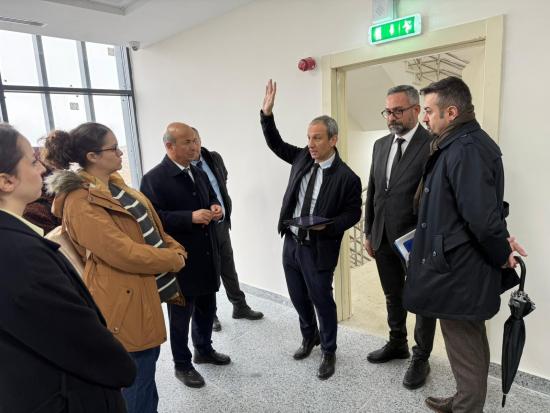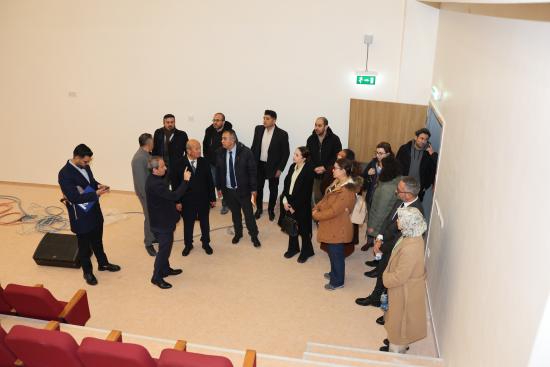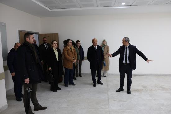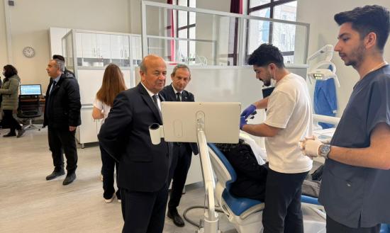 Heyete ayrıca yapımı tamamlanan ve 89 ünit kapasitesine sahip yeni Diş Hekimliği Hastanesi ile Fakülte Binası gezdirilerek kompleksin fiziki altyapısı, teknolojik donanımı, klinik ve laboratuvar alanları ile simülasyon ve uygulama üniteleri hakkında detaylı bilgi verildi. Modern mimarisi ve güçlü altyapısıyla dikkat çeken kompleksin, hizmete girmesiyle birlikte Türkiye’nin önde gelen diş hekimliği fakülteleri arasında yer almasının hedeflendiği; öğrencilerin uygulama ağırlıklı eğitim almasına imkân tanıyacak şekilde planlandığı ve hastalara nitelikli, erişilebilir ve çağdaş sağlık hizmeti sunmayı amaçladığı ifade edildi.