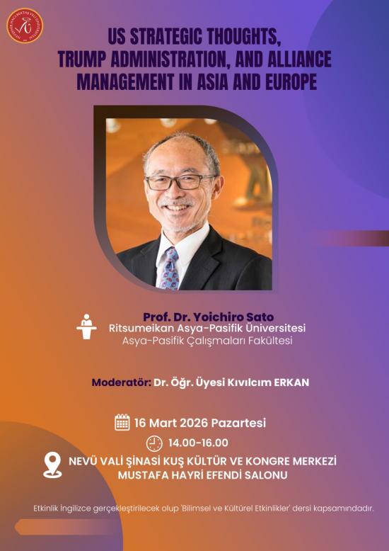 TÜBİTAK 2221 kapsamında NEVÜ’ye konuk araştırmacı olarak gelen Ritsumeikan Asya-Pasifik Üniversitesi Asya-Pasifik Çalışmaları Fakültesi öğretim üyesi Prof. Dr. Yoichiro SATO “US Strategic Thoughts, Trump Administration, and Alliance Management in Asia and Europe” adlı bir seminer verecektir.