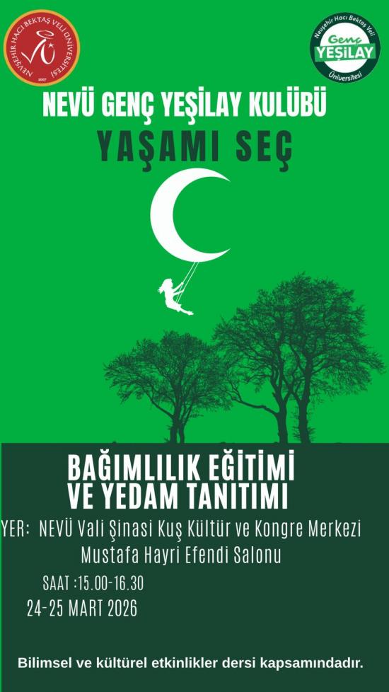 NEVÜ Genç Yeşilay Kulübü olarak YEDAM merkezi tarafından 24-25 Mart 2026 tarihlerinde 15.00-16.30 saatleri arasında düzenlenecek olan “Bağımlılık Eğitimi” etkinliğine, bağımlılıklar hakkında bilinçlenmek ve farkındalık kazanmak isteyen herkes davetlidir.