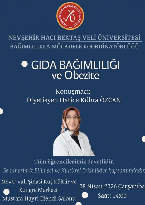 Bağımlılıkla Mücadele Koordinatörlüğü tarafından  "Gıda Bağımlılığı ve Obezite" konulu seminer düzenlenecektir.