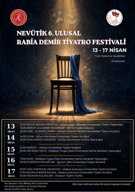 Nevşehir Hacı Bektaş Veli Üniversitesi (NEVÜ) Tiyatro Kulübü tarafından düzenlenen “6. Ulusal Rabia Demir Tiyatro Festivali”, 13-17 Nisan 2026 tarihleri arasında sanatseverlerle buluşacak.