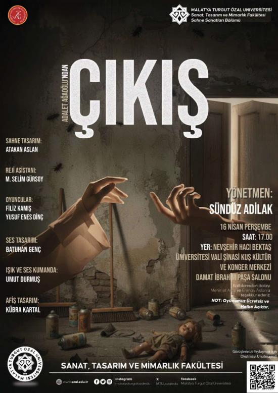 NEVÜ Tiyatro Kulübü tarafından düzenlenen 6. Ulusal Rabia Demir Tiyatro Festivali kapsamında "Çıkış" adlı tiyatro oyunu sahnelenecektir.