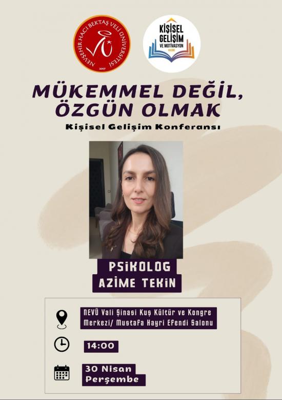 Nevşehir Hacı Bektaş Veli Üniversitesi Kişisel Gelişim ve Motivasyon Kulübü tarafından düzenlenen “Mükemmel Değil, Özgün Olmak” başlıklı kişisel gelişim konferansına tüm öğrencilerimiz davetlidir.
