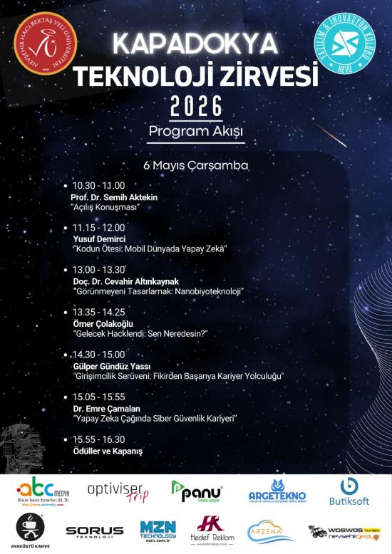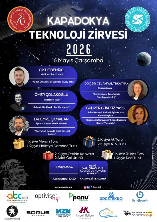 Üniversitemiz Yazılım ve İnovasyon Kulübü tarafından “Kapadokya Teknoloji Zirvesi 2026” temalı etkinlik üniversitemiz öğrencilerinin teknoloji dünyasındaki güncel gelişmeleri sektör profesyonellerinden dinlemelerini sağlamak amacıyla 6 Mayıs 2026 Çarşamba günü düzenlenecektir.